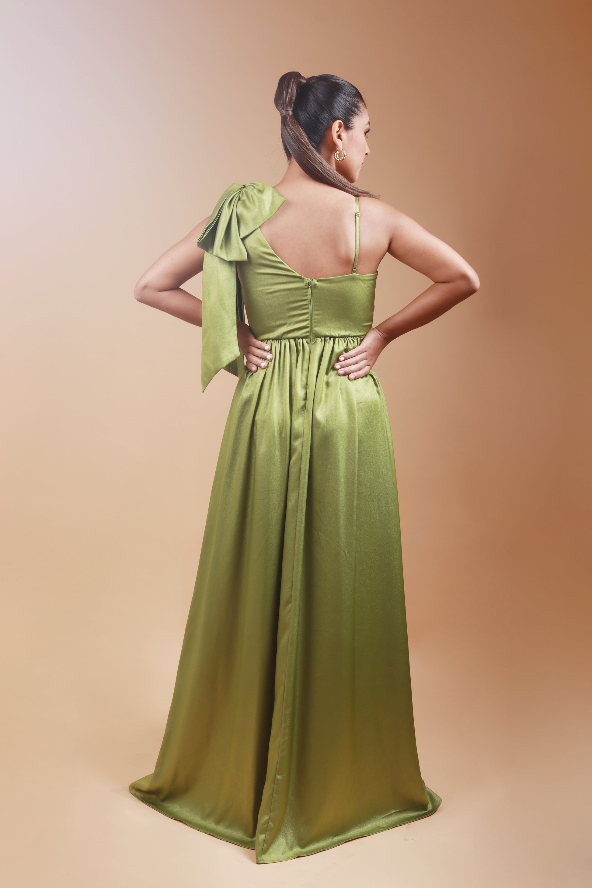 La elegancia cobra vida en verde. Con su escote corazón asimétrico y moño escultórico, celebra el poder de lo natural y lo moderno. Su tela es satinada, tiene delicados tirantes ajustables y un gran lazo en el hombro, aportando un toque sofisticado y femenino.